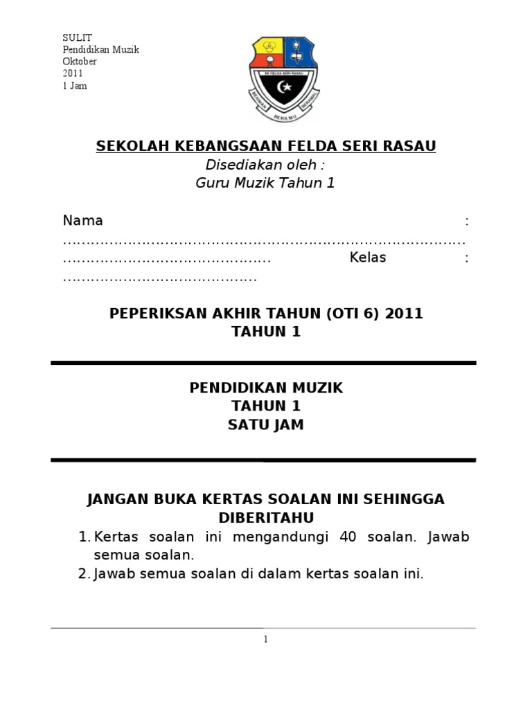 Jangan buka kertas soalan ini sehingga diberitahu 1. Selepas download anda boleh cetak (print). You can do the exercises online or download the worksheet as pdf. Sejarah tahun 6 tajuk 12: Pic bagi solfa 'so' lebih tinggi daripada 'mi' ( ) 4. Penyelesaian masalah melibatkan pecahan tahun 6. Tahun 5 (tak buat) 6. Semua mata pelajaran tahun 6 disenarai di bawah. Ujian akhir tahun muzik tahun 5 by norazlaili mokhtar 3298 views. Panduan menjawab soalan akhir tahun kafa tahun 4 bahagian kerja khusus. Soalan muzik thn4 akhir tahun.pdf. 33914783 soalan ujian muzik tahun 5. Panduan pengajaran pendidikan muzik tahun 6.